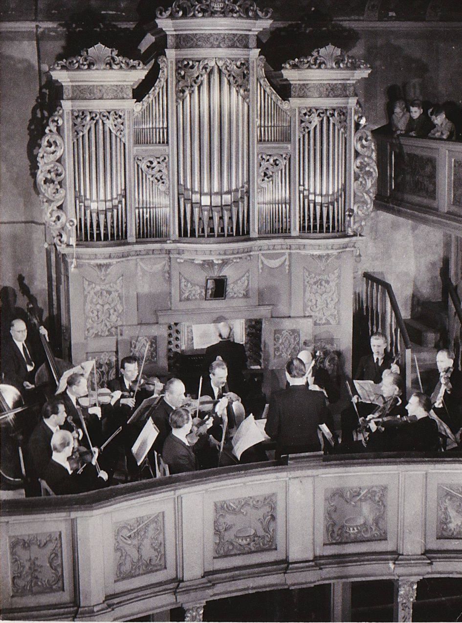 Aus einer alten Fotokiste eine private Aufnahme von 1952, auf der das MDR-Kammerorchester unter Leitung des Dirigenten Rudolf Weiß des Mitteldeutschen Rundfunks, Sender Leipzig, zusammen mit dem Organist Hanns-Ander Donath | Bild | zu sehen sind. Sie entstand während eines Abschlusskonzertes für die Gemeinde Fraureuth nach tagelangen Rundfunkaufnahmen der Mozart'schen Kirchensonaten, die allerdings beim DDR-Rundfunk offiziell so nicht bezeichnet werden durften.